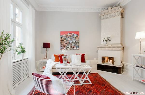 Không gian nhỏ trở nên ấm áp, quyến rũ đầy phong cách khi được lựa chọn thảm trải sàn và gối tựa màu đỏ, bức tranh treo tường màu hồng cam cùng sự có mặt khéo léo của những chậu cây nhỏ mang đến nét hài hòa, xinh tươi cho khoảng chức năng này.